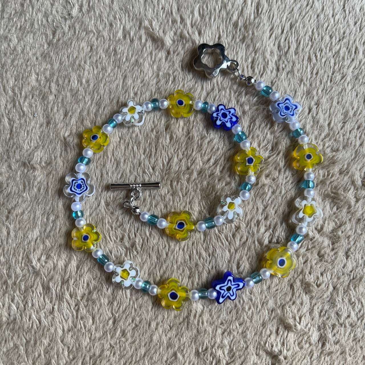 ミルフィオリガラスビーズのイエローとブルーの組み合わせが爽やかです♪