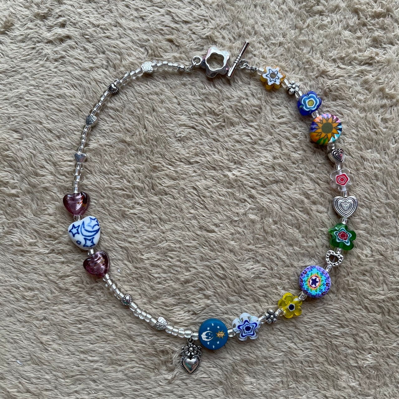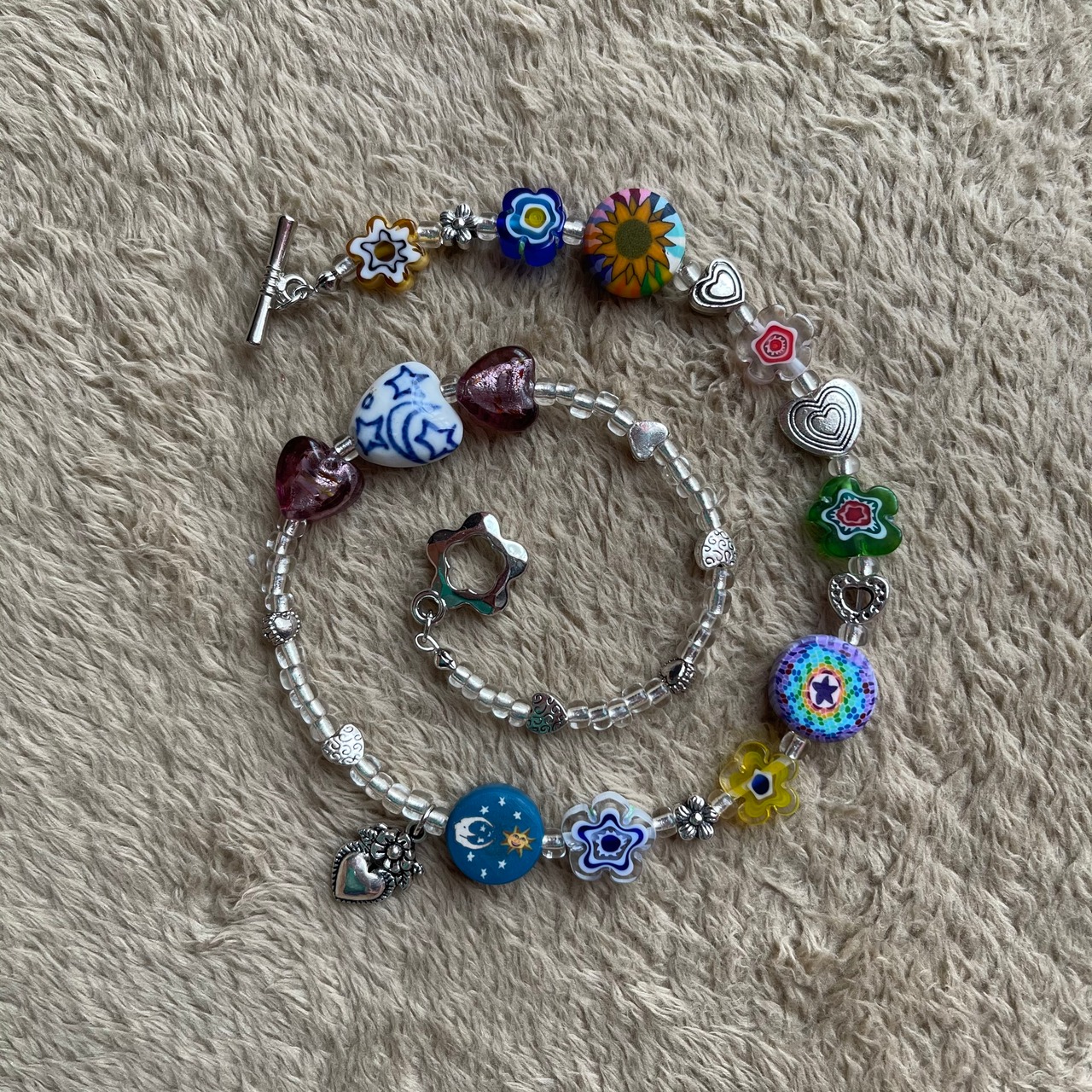 ミルフィオリフラワービーズとシルバーハートの組み合わせが可愛いです♡♡